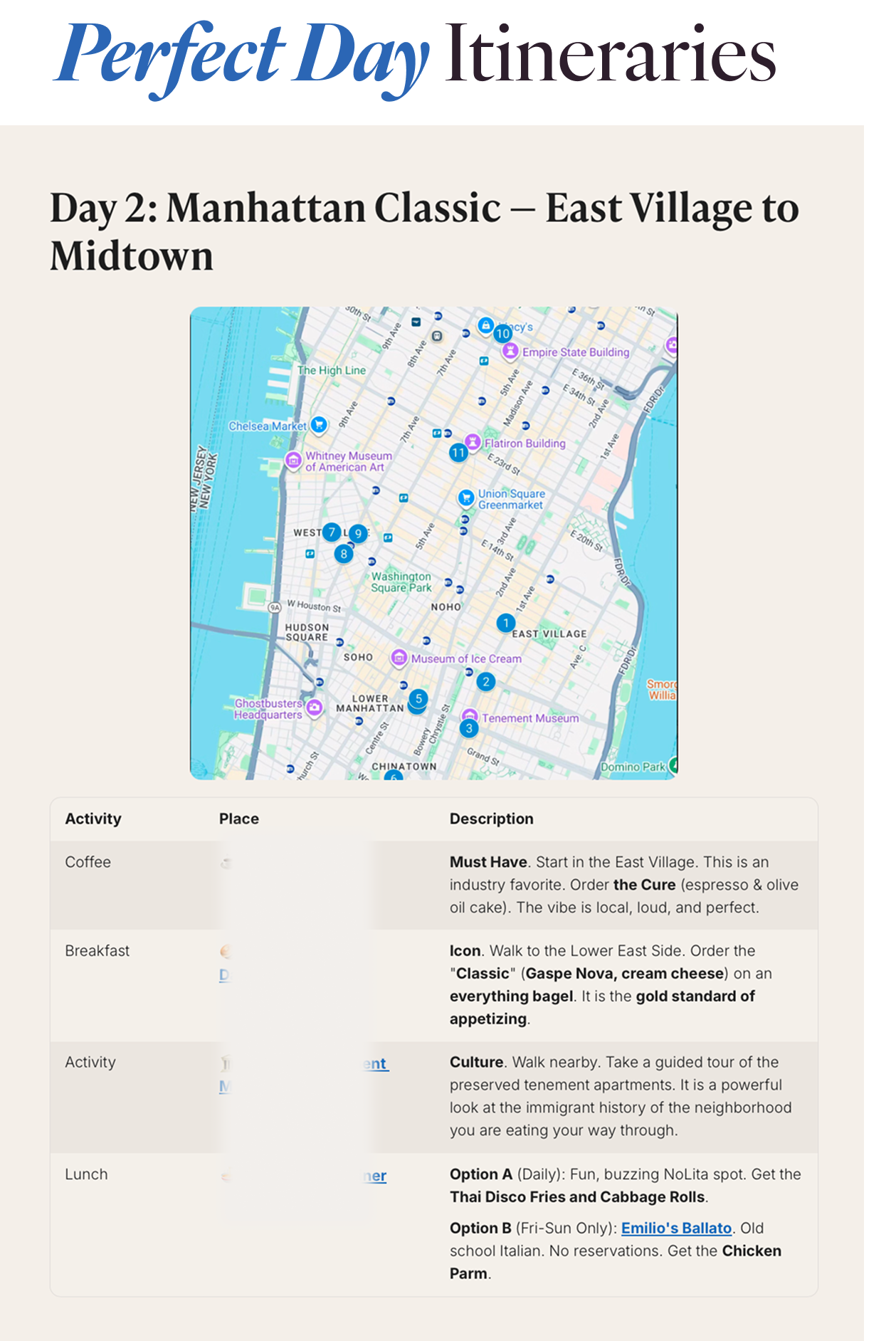 You’ll get clear recommendations on which neighborhoods to focus on, and exactly where to eat and drink so you’re not wasting meals on random spots near Times Square.