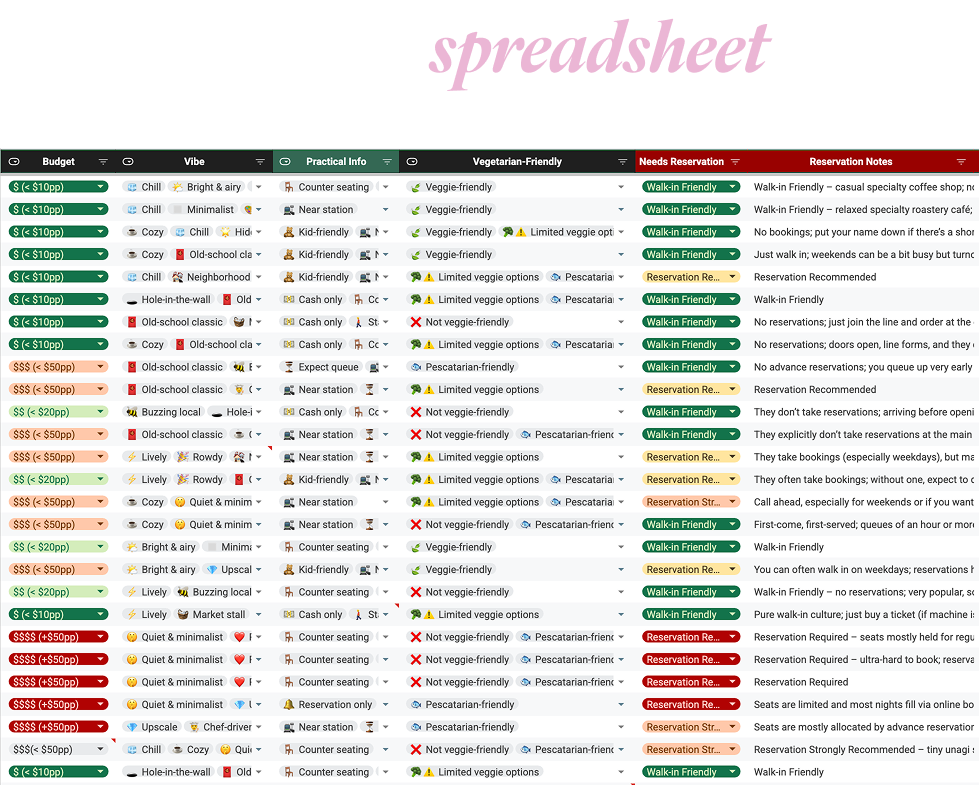 Bonus spreadsheet so you can filter by budget, vibe, occasion, dietary restrictions, and more.
